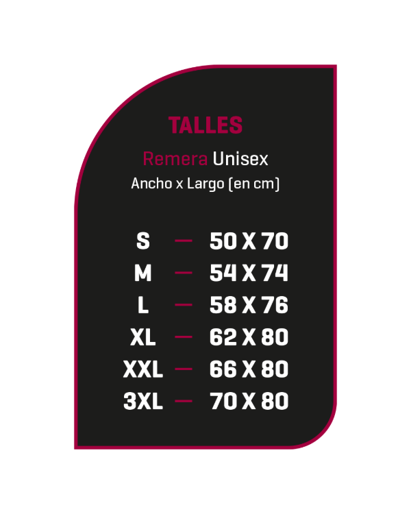 Tamaño aproximado de estampa trasera de 38x55 centímetros y 8x8 cm el frente para todos los talles.